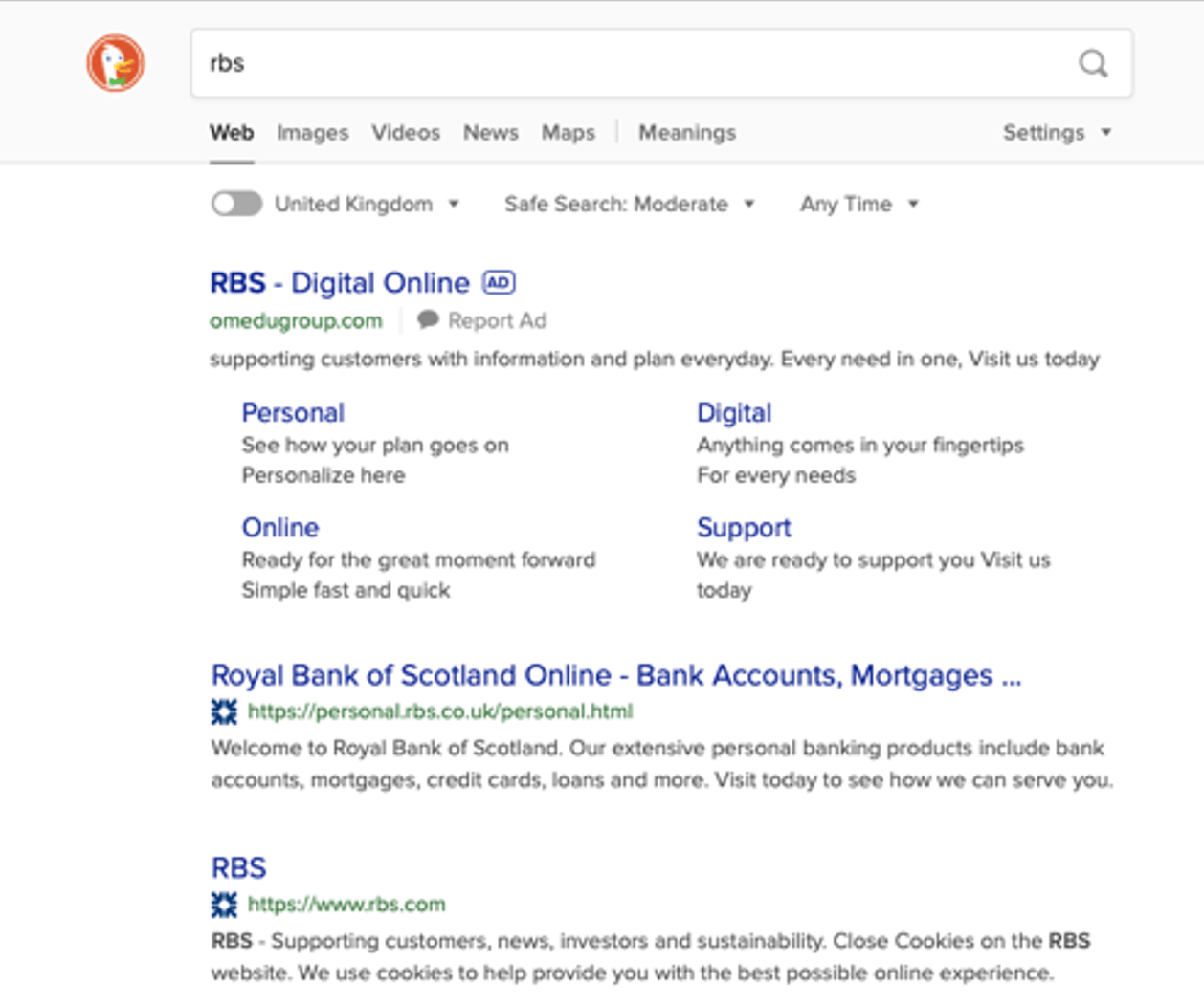 The Kin search engine was first conceived after an attempted phishing attack was discovered in an advert presented by the search engine DuckDuckGo. Gordon Povey, founder of Better Internet Search and the Kin search engine, discovered that an ad was pretending to be the real Royal Bank of Scotland (RBS), but only realised this after an attempt to login to his account failed and the full password was requested. The screenshot below shows the advert (linking to the phishing website) followed the proper RBS links.