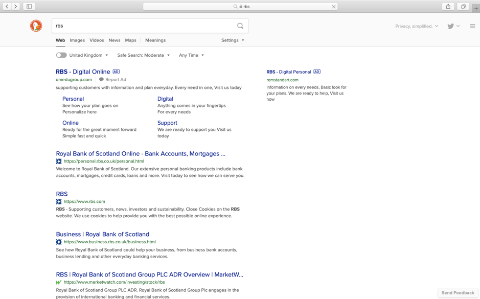 This morning I was using a competitor’s search engines (which I do regularly for ongoing research). I needed to access my business bank account, I was using the search engine called 'Duck Duck Go' and didn’t have a bookmark so I typed in the acronym of my bank “rbs” into the search bar and this is what appeared.