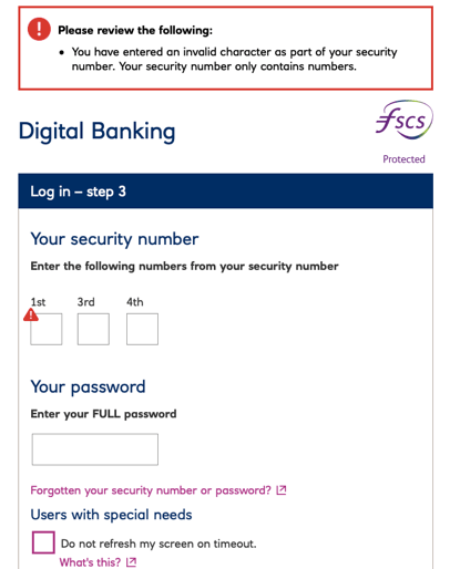 If you fill in the customer ID (I did this with some random digits) it then takes you to the screen asking for 3 out of the 4 numbers from your PIN and some of the characters from your password. After, I completed this (with some random data) I was then presented with the following screen saying I had entered the numbers incorrectly and asking for different numbers from my PIN and this time asking for my “FULL password”!