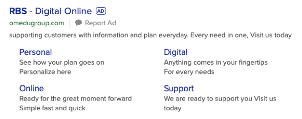 Note that the top right and top left both show ads. Neither are actually ads for the real RBS (Royal Bank of Scotland) but they look like they could be, especially the one on the left as it is offering you all of the bank services you would expect. This ad is not just ‘bad’ it is evil, insidious (other adjectives apply) and what hides behind it is clearly fraudulent and illegal. And yet, this was the top ad served to me by Duck Duck Go (DDG) – a search engine believed to be one of the better, more ethical ones. While there is no accusation that DDG would serve an ad they knew to be fraudulent, the fact is that there is very little screening and the ads most likely to generate high click revenues are selected. Here is a more detailed image of the offending ad.